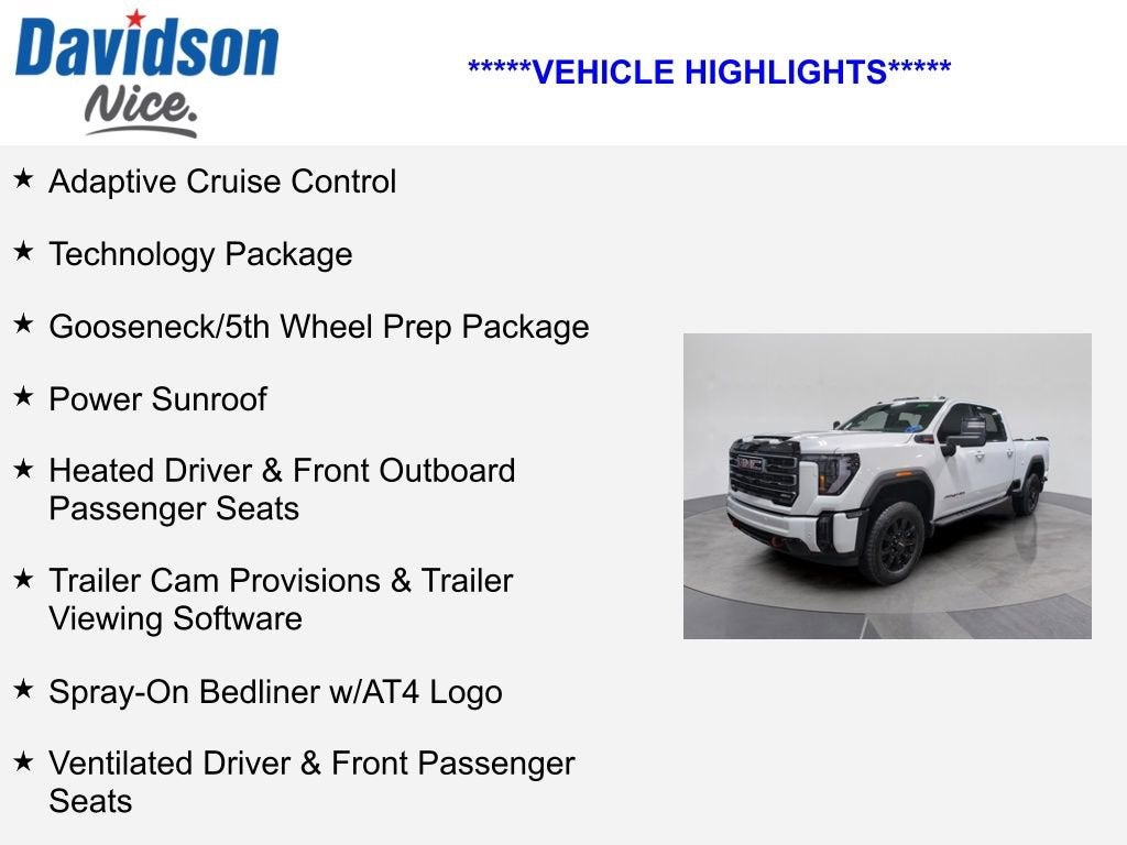 Adaptive Cruise Control, Technology Package, Gooseneck/5th Wheel Prep Package, Power Sunroof, Heated Driver & Front Outboard Passenger Seats, Trailer Cam Provisions & Trailer Viewing Software, Spray-On Bedliner w/AT4 Logo, Ventilated Driver & Front Passenger Seats, Sierra 2500HD AAT4, 4D Crew Cab, Duramax 6.6L V8 Turbodiesel, 10-Speed Automatic, 4WD, Summit White, Jet Black With Kalahari Accents Leather.